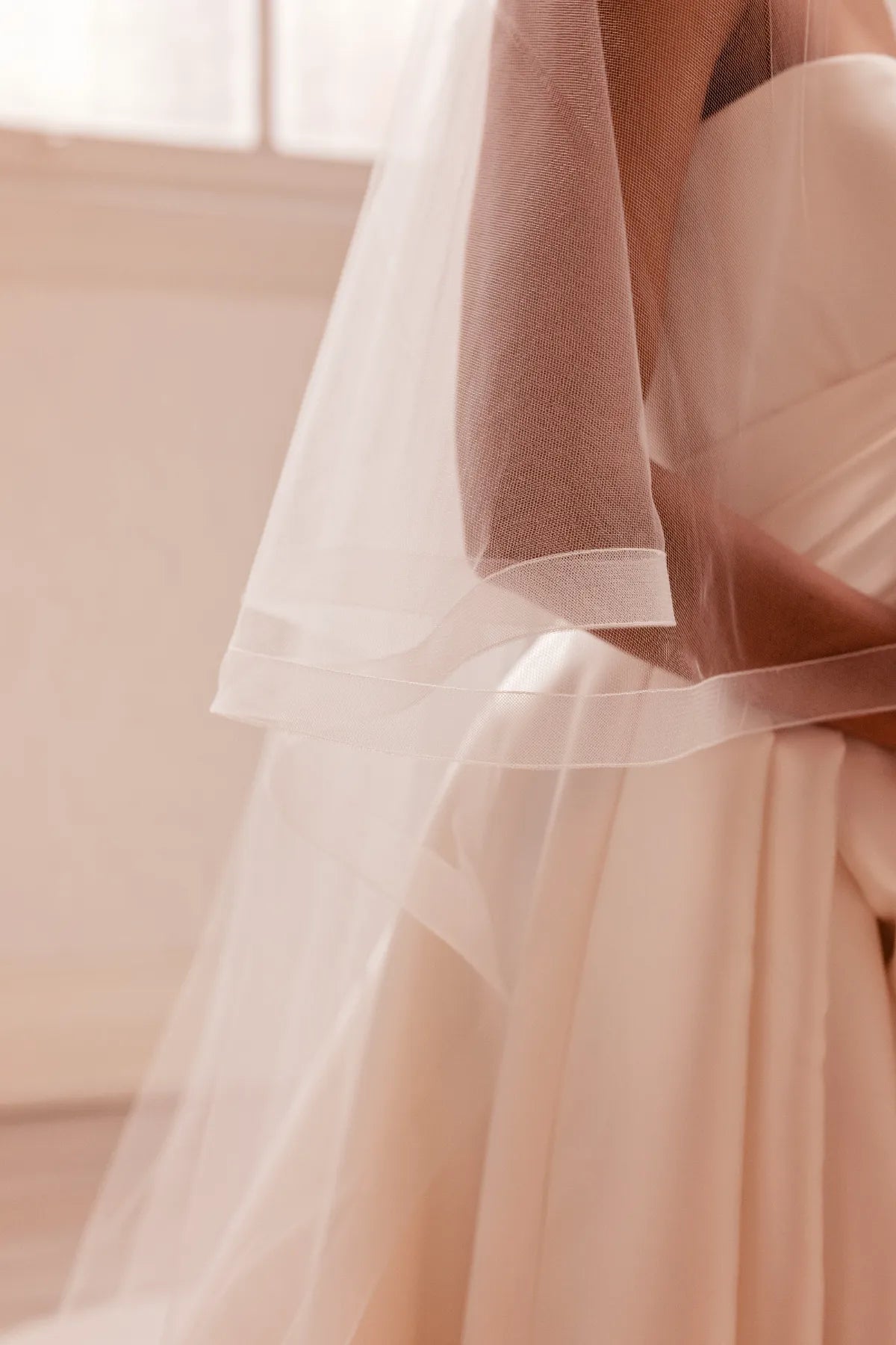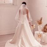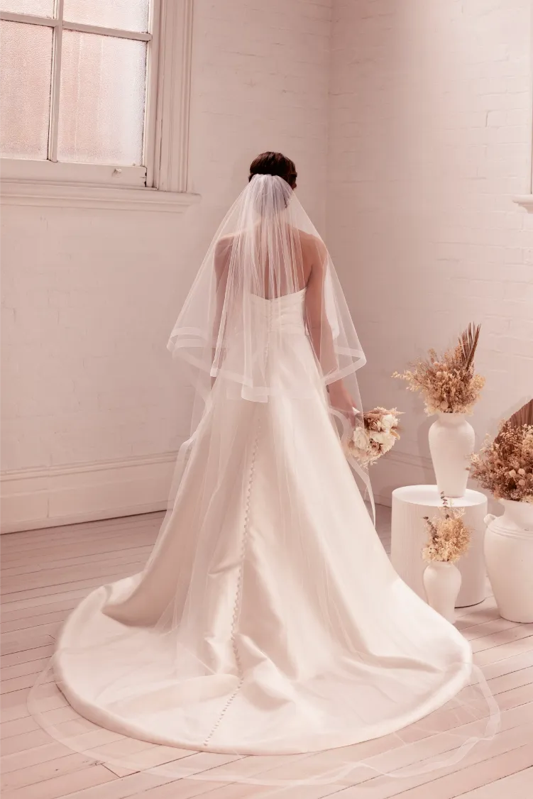 Finished with a refined one-inch crinoline edge, Elizabeth adds subtle definition and structure, elevating its delicate design while maintaining an elegant, understated feel. The result is a veil that beautifully frames your gown without overpowering it.