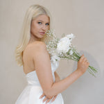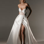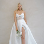 Made from Mikado and tulle, Aeon features a sheer, structured corseted bodice with a draped twist knot detail, exuding charm. The dramatic full skirt with a split adds a touch of daring, while hidden side pockets offer practical elegance.
