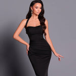 Classic meets contemporary in the Herve dress — a timeless black gown with modern edge. This sleek, body-hugging silhouette is crafted from a stretch fabric that sculpts and flatters in all the right places. The structured bodice features a subtle scoop neckline and bold halter straps for a touch of sophistication, while soft gathering at the waist enhances the hourglass shape. Perfect for black-tie events, formals, or any evening where elegance is essential, Herve is the little black dress — elevated.