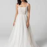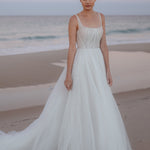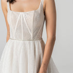 Step into a fairytale with the Loren Gown. This enchanting gown is adorned with glitzy lace detail from head to toe, exuding a radiant sparkle. The flattering A-line silhouette ensures a timeless and elegant fit, while the square neckline and boned bodice offer structured support and a touch of vintage charm. The straight back and delicate straps complete this exquisite design, making it perfect for the bride who desires a blend of glamour and classic beauty on her special day.