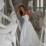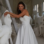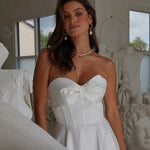 Elevate your bridal look with the Nixie dress. Crafted from soft satin, this gown features a strapless sweetheart bodice with a bow detail and a fully exposed boned corset for added structure. The full A-line skirt, complete with a sweeping cathedral train and side pockets, combines grandeur with practicality. Inner bra cups and medium-weight interlining ensure comfort, while the fully lined design and back invisible zipper provide a flawless finish. Make a lasting impression on your special day with this modern masterpiece.
