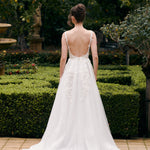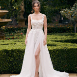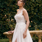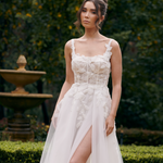 Bold, romantic, and effortlessly modern – the Pasadina gown is designed for the bride who wants to make an entrance. Featuring a sculpted bodice adorned with delicate floral appliqué and a flattering square neckline, this gown blends timeless elegance with contemporary edge. A daring leg split adds just the right amount of drama to the soft, flowing skirt.