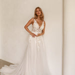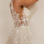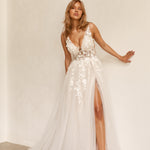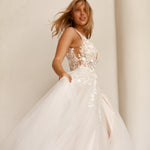 The Lucille wedding dress is a timeless A-line silhouette that exudes classic charm. It features an illusion plunging V-neck bodice adorned with delicate 3D botanical lace, cascading elegantly from thick straps to the hips. Nude tulle modesty panels enhance the underarm and center front for a refined touch. The voluminous skirt, lined with soft satin, includes a thigh-high split, adding a subtle hint of modern allure. Available in vintage white and vintage white with blush lining, the Lucille dress offers a beautifully sophisticated option for your special day.