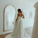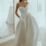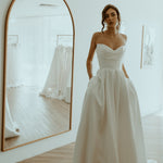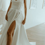 Effortlessly elegant, this classic A-line gown is crafted from smooth crepe for a clean, structured silhouette. The strapless sweetheart neckline is enhanced by a soft pleated panel over the bust, adding a touch of texture and sophistication. Side pleats in the skirt create graceful volume, while a thigh-high split adds a modern, confident edge. Perfect for the bride seeking timeless style with a contemporary twist.