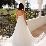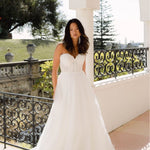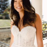 Effortlessly romantic, the Sana Gown embodies timeless beauty for the modern bride. This strapless gown features a delicately embroidered bodice with a subtle sweetheart neckline, enhancing femininity with grace. The soft A-line skirt flows into an enchanting train, creating a dreamy silhouette perfect for any venue. Buttons down the back add a classic touch, while the lightweight layers of tulle allow for easy movement and elegance. Ideal for the bride seeking understated luxury, Sana brings an air of effortless charm to your walk down the aisle.