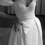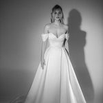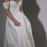 Soulmate is love at first sight, get ready to fall in love with her perfectly sculpted bodice. Featuring draped detailing and flirty off-the-shoulder sleeves, Soulmate exudes timeless femininity and allure with a full skirt that unveils a playful split.