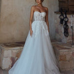 Featuring inner nude bra cups and exposed boning for support, and a fully lined skirt for comfort, this dress is crafted with the finest materials. The stunning beaded lace appliqué and layered tulle make the Maia perfect for feeling like a princess on your special day. Say "yes" to the dress and make your wedding dreams come true!