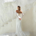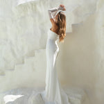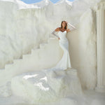 The Emmy gown exudes effortless sophistication with its chic strapless design and sleek sweetheart neckline. Crafted with elegant diagonal draping that softly contours the bodice and hips, it creates a beautifully sculpted silhouette. The look is elevated by detachable sheer long sleeves, adding a touch of modern romance and versatility—perfect for transitioning from ceremony to celebration with ease. Timeless yet fashion-forward, Emmy is the epitome of understated glamour. Available now with 20% off for a limited time during the Willow & Winter Trunk Show — discount applied at checkout.